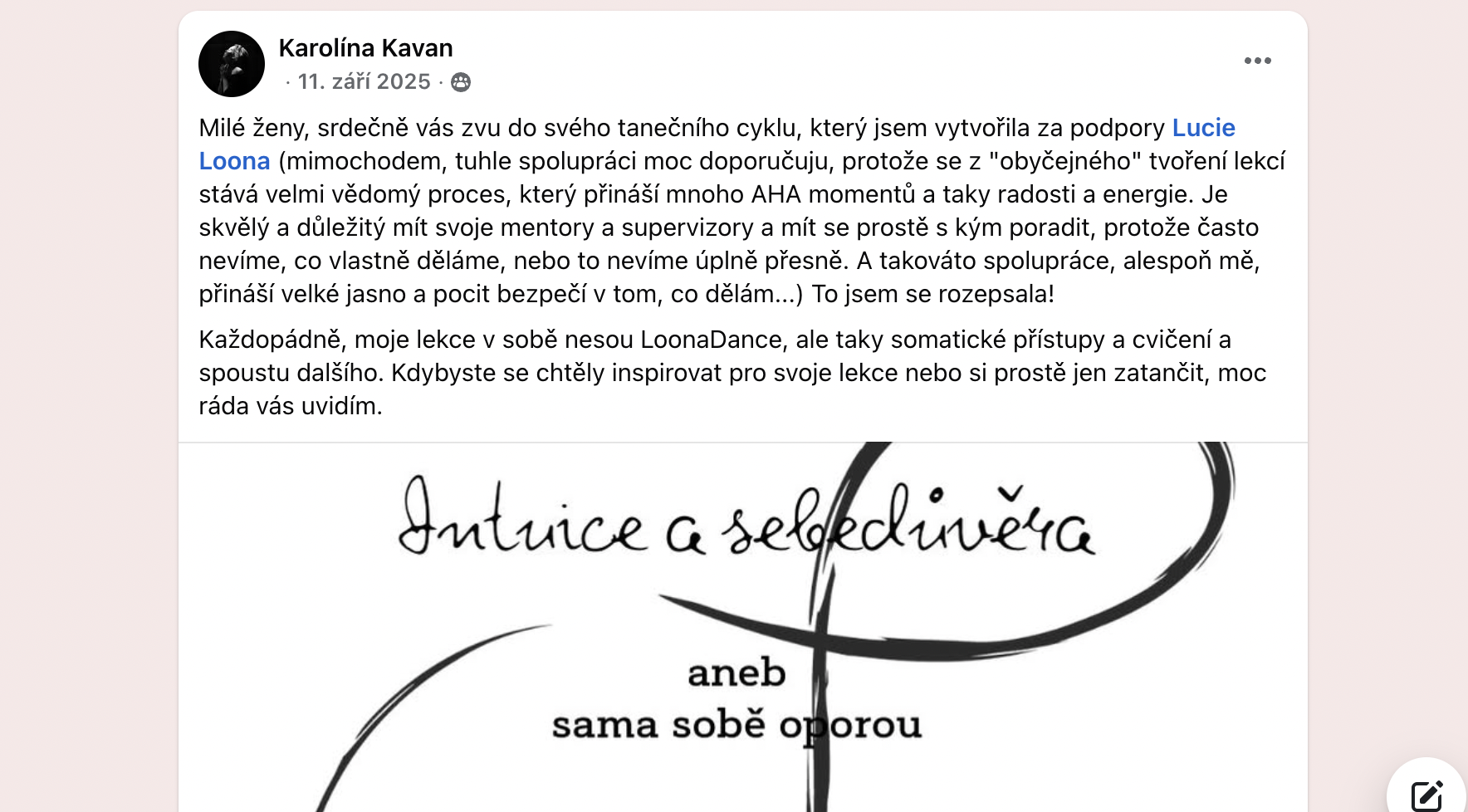 "Jsem absolventkou LDA, cesty vědomého ženství, kterou Lucie vytvořila. Po jejím absolvování, jsem začala vést taneční ženské kruhy a s Lucií jsme měly pravidelné supervize, které mi pomáhaly řešit výzvy, kterým jsem v nové roli lektorky čelila. Tyto supervize se plynule proměnily v mentoringová sezení se širokým záběrem témat (podnikání, moje talenty a mise, volání mé duše, práce s omezujícími přesvědčeními). Lucie mi je už 3 roky laskavou průvodkyní, která ve své práci dává prostor jak svým bohatým zkušenostem z pole seberozvoje, tak své hluboké intuici. Při našich rozhovorech mě vede k nahlížení na situaci z různých úhlů, odpovědi na své otázky si však musím najít sama, Lucie je mi svědkem a laskavou průvodkyní. Je docela těžké popsat, co přesně se děje v našich sezeních, ale asi je důležitější co se děje poté. Někdy si odnáším spoustu inspirativních "domácích úkolů", díky kterým se vše může dít v mém vlastním tempu. Někdy je to povzbuzení pokračovat v započatém projektu, vždy spoustu uvědomění a zvědomění. Pro mě osobně je důležité mít prostor, ve kterém můžu formulovat svoje prožitky a myšlenky do slov. Lucie má dar naslouchání nejen slovům, ale i energii kterou nesou a její zpětná vazba mi dává spoustu užitečných vhledů.